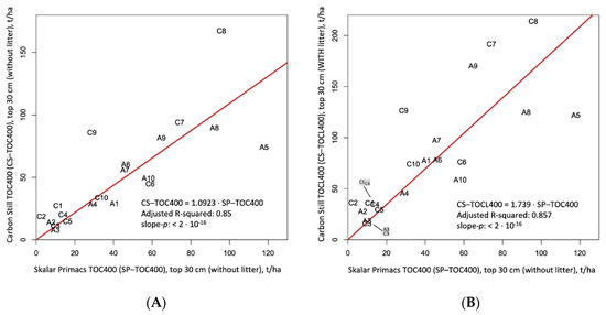 (A) Linear regressions between organic carbon estimated in organic mineral soil samples with Carbon Still (CS–TOC400) and Skalar Primacs (SP–TOC400). (B) Linear regressions between organic carbon estimated in organic mineral soil plus in litter samples with Carbon Still (CS–TOCL400) and organic carbon estimated in organic mineral soil samples with Skalar Primacs (SP–TOC400). Sliding from left to right on the graphs you go from the beach into the forest at the two sites (A = Albarella; C = Caleri): 1–2 = beach; 3–4 = dune; 5–6 = shrubland; 7–8 = forest; 9–10 = other (two humid areas in Caleri; flower bed, and new plantation in Albarella).