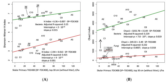 Linear regressions between (A) Shannon–Wiener or (B) Chao1 indices (OTUs of bacteria and fungi) and the Skalar Primacs TOC400 (SP–TOC400) in Albarella and Caleri. Let us remember that there is a strong linear model that links the measurements made with the Skalar Primacs (SP–TOC400) with those made with the Carbon Still (CS–TOC400) (Figure 10A) and (CS–TOCL400), also with the carbon contained in the litter, (Figure 10B).