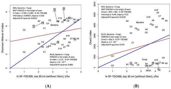Linear regressions between (A) Shannon–Wiener or (B) Chao1 indices (OTUs of bacteria and fungi) and the logarithm (ln) of Skalar Primacs TOC400 (SP–TOC400) measured in Albarella and Caleri.