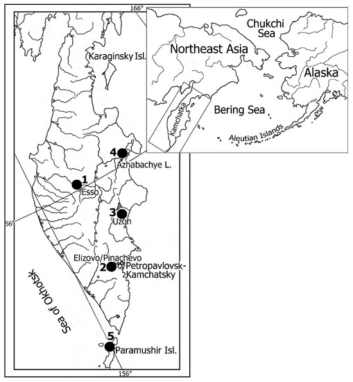 - Kurentsov, A.I. Zoogeography of Kamchatka. In Kamchatka Fauna; Kamchatka Complex Expedition of the USSR Academy of Sciences. Moscow–Leningrad; Publishing House of AS USSR: Saint Petersburg, Russia, 1963; pp. 3–60. (In Russian) [Google Scholar]