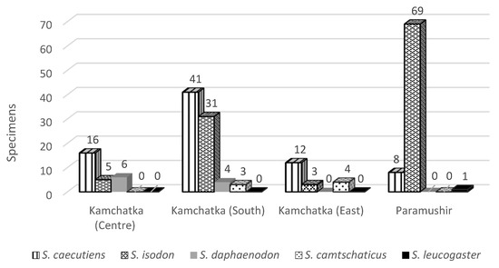 Kamchatka Peninsula, located in the extreme northeast of Asia, is distinguished by distinct geographical, climatic, and faunistic features [1]. Of the 12 shrew species recorded in the Russian Far East (Sorex caecutiens Laxmann, 1788; S. camtschaticus Yudin, 1972; S. daphaenodon Thomas, 1907; S. gracillimus Thomas, 1907; S. isodon Turov, 1924; S. jacksoni Hall et Gilmore, 1932; S. leucogaster Kuroda, 1933; S. minutissimus Zimmermann, 1780; S. mirabilis Ognev, 1937; S. roboratus Hollister, 1913; S. tundrensis Merriam, 1900; S. unguiculatus Dobson, 1890) [2], less than half of them have been found in Kamchatka (S. caecutiens, S. camtschaticus, S. daphaenodon, S. isodon, S. minutissimus) [3]. Paramushir Island was part of the Kamchatka Peninsula at the maximum of the last glaciation. Currently, only three shrew species inhabit the island (S. caecutiens, S. isodon, S. leucogaster) [4].