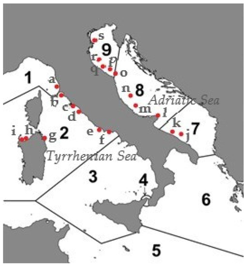 - Bianchi, C.N. Proposta di suddivisione dei mari italiani in settori biogeografici. Not. SIBM 2004, 46, 57–59. [Google Scholar]