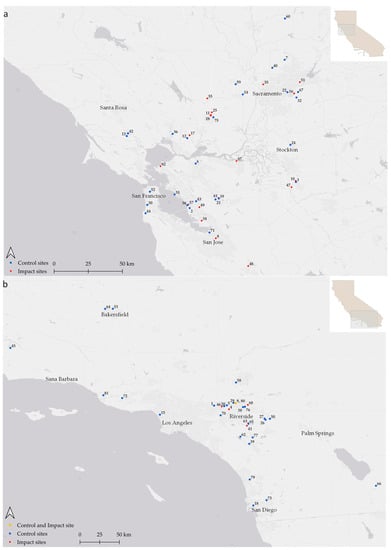 Locations of 78 project sites in (a) northern California and (b) southern California where we completed reconnaissance surveys used in a before–after, control–impact (BACI) experiment of the effects of development (habitat loss) on species of vertebrate wildlife. Numbers refer to before and after pairs of surveys, which are described in Table A1.