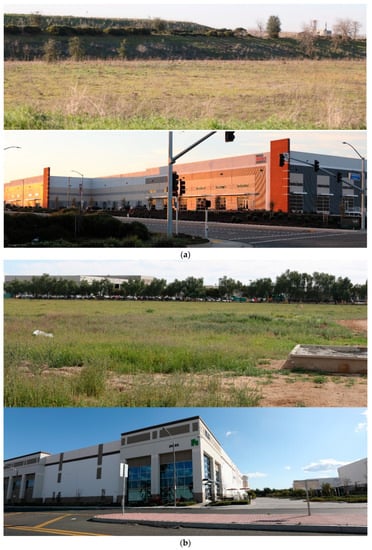 (a) GLP Warehouse project site on 12 February 2020 (a, top) and 18 February 2022 (a, bottom). (b) First Industrial Warehouse project site on 28 February 2020 (b, top) and 5 February 2023 (b, bottom). (c) Winters Highlands residential project site on 18 May 2004 (c, top) and 11 June 2021 (c, bottom). A pair of burrowing owls are visible in the foreground, center-left aspect of the top photo.