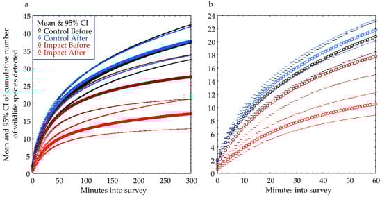 Mean and 95% confidence intervals (CI) of the model-predicted number of vertebrate wildlife species detected by minute into the reconnaissance survey, and extended to 5 h (a) and only 1 h (b), where for each survey the model fit to the cumulative number of species detected, Y, was of the form: , where X represents minutes into the survey, and a, b, and c are the best-fit coefficients. The coefficient of determination, r2, averaged among the models fit to the data.