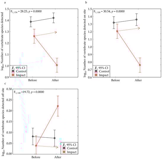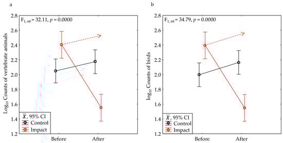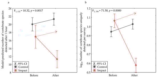 We used 2-factor analysis of variance with interest mostly in the significance of the interaction effect between the before–after time period (BA) and the control–impact treatment (CI) of each BACI experiment, as implemented by others [,]. We performed the tests on data collected from the project areas as well as those strictly from onsite. Except for our model-predicted number of species detected after one hour of surveying, we log10-transformed count variables, such as the number of species detected and number of animals counted. We visually examined normal probability plots, and we performed Hartley’s F-max test for homogeneity of variance to determine whether our tests met the assumptions of ANOVA. The assumptions were met in nearly every test. To further assess the 2-factor ANOVA interaction effects, we calculated their statistical power.