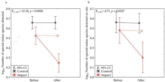 BACI tests revealed that development reduced the number of special-status species detected by 49% (a) and the number of special-status species detected within the bounds of the study site by 58% (b). The red dashed arrow points to the expected value had no development impact occurred.