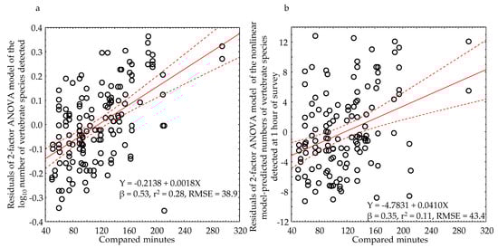ANOVA residuals of: (a) number of vertebrate species detected and (b) model-predicted number of vertebrate species detected at one hour regressed on survey duration (minutes).