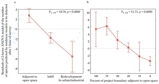 ANOVA residuals of model-predicted number of vertebrate species detected at one hour, compared by (a) whether the project site was situated in open space or as infill or redevelopment within developed areas, and by (b) the percentage of the project boundary adjacent to open space.