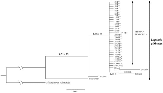 - Detta, A. The genetic origin and dispersal of introduced pumpkinseed (Lepomis gibbosus) in the Iberian Peninsula. Master’s Thesis, Trent University, Peterborough, ON, Canada, 2011; p. 86. [Google Scholar]
