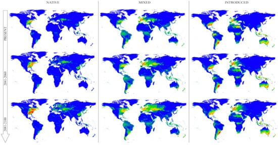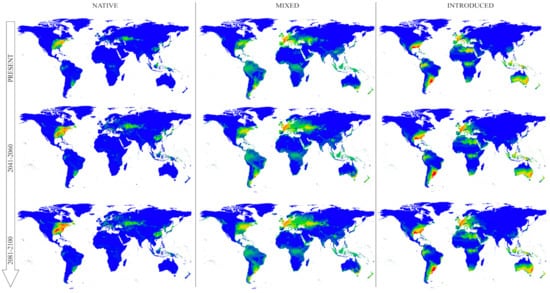 - Bellard, C.; Jeschke, J.M.; Leroy, B.; Mace, G.M. Insights from modeling studies on how climate change affects invasive alien species geography. Ecol. Evol. 2018, 8, 5688–5700. [Google Scholar] [CrossRef] [PubMed]