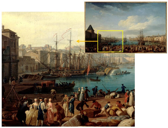 Top right, view of the port of Marseilles, seen from the Pavillon de l’Horloge du Parc within the port (‘L’intérieur du port de Marseille, vu du pavillon de l’horloge du Parc’), painting by Claude-Joseph Vernet, 1754, conserved in the Musée National de la Marine in Paris (France). Below left, a detail showing, on the right, a vessel careened to allow workers, onboard small boats, to scrape the fouling from the hull. Reprinted with permission from the Musée National de la Marine (Agence Photographique de la Réunion des Musées Nationaux, Paris, France).