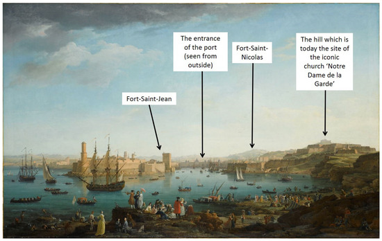 Why did the introduction fail? The ‘yellow mussel’ was immediately perceived as exotic, and its introduction vector was identified as the fouling on the hulls of vessels arriving in the port of Marseilles [45,46,47]. Darluc [46] mentions that the mussels were thrown on the rocks below the citadels. Before leaving a port for a new voyage, the hull was sometimes cleaned (careening) of the largest fouling organisms, whose presence would slow down the boat. This ship maintenance, still practised nowadays, though less frequently because of the use of antifouling paints, was in use in the 18th century. That was also the case in the port of Marseilles, as illustrated in a painting by Vernet (Figure 1), where the citadels can be identified as Fort-Saint-Jean and Fort-Saint-Nicolas. These still-standing forts, which frame the entrance of the port, were erected by the king of France, Louis XIV ‘the Sun King’, between 1660 and 1664, not to protect the city from enemy fleets but to subdue the rebellious spirit of its inhabitants who, after almost 21 centuries of independence (an independence which was, according to historians, relative and open to discussion), had recently been incorporated into the Kingdom of France [77] (Figure 2).