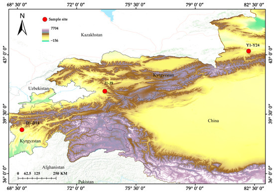 Wild walnuts were collected from wild walnut populations in several Central Asian countries. In all, we collected 23 wild walnuts (Y) from Ili, Xinjiang, China, 14 wild walnuts (D) from Dushanbe, Tajikistan, and 9 wild walnuts (J) from Wild Fruit Forest Reserve, Kyrgyzstan (Table 1, Figure 1). All leaf material was taken from fresh and healthy leaves. Upon collection, we ensured that each plant from which we collected walnuts was more than fifteen meters apart from another collected sample. The collected leaves were dried with silica gel and numbered. Using the DNA safe Plant Kit (Tiangen Biotechnology, Beijing, China), genomic DNA was extracted from the leaves of J. regia L. in accordance with the manufacturer’s instructions. Before polymerase chain reaction (PCR), the DNA samples were diluted to approximately 20 ng/mL.