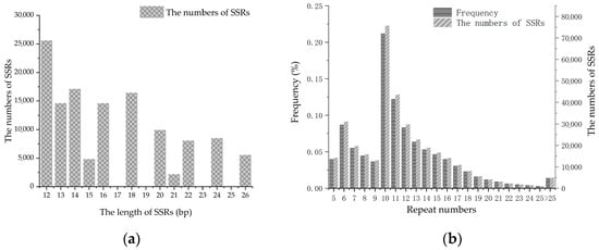 Characterization of SSR loci. (a) Number of SSRs of different lengths. (b) Frequency and number of SSRs with different number of replicates.