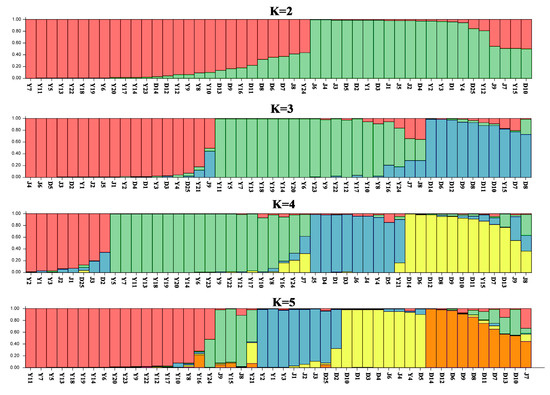 Bar plot showing the genetic structure of the 48 walnuts between K = 2 and K = 5. The vertical bars represent the membership coefficients (qi) of each individual.