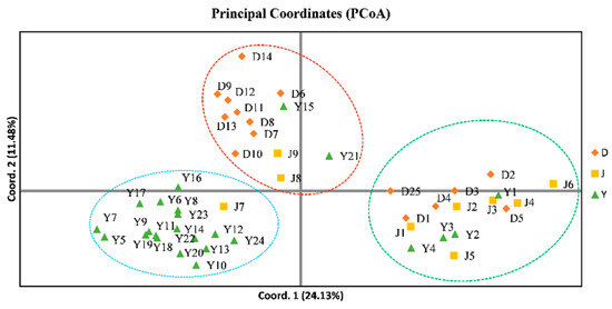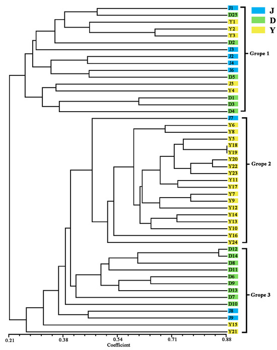 The PCoA of 48 wild walnut materials is shown in Figure 5. The results showed that 48 wild walnut materials were divided into three groups: the first group comprised five samples of walnuts from Tajikistan (D), five samples of walnuts from Kyrgyzstan (J), and three samples of walnuts from Ili (Y); the second group consisted of nine samples of wild walnuts from Kyrgyzstan (J), two samples of walnuts from Kyrgyzstan (J), and two samples of wild walnuts from Ili (Y); and the third group consisted of 18 samples of wild walnuts from Ili (Y) and one sample of walnuts from Kyrgyzstan (J). The first principal coordinate and the second principal coordinate accounted for 24.13% and 11.48% of the total variation of the total coordinates, respectively, explaining the total genetic variation of the 22 SSR loci.