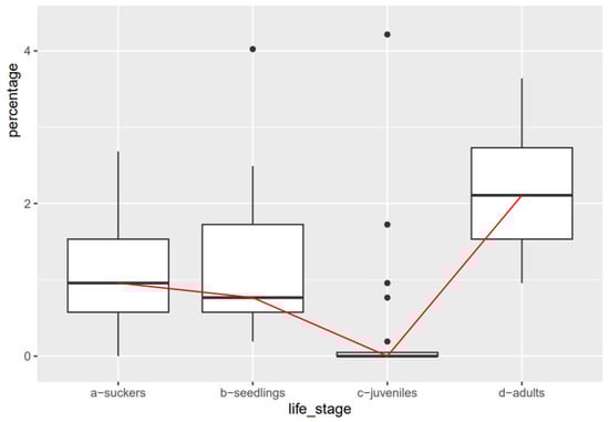 First, we found that the population of E. lanatus follows a ‘J’ structure (Figure 2) with a significantly higher proportion of adults than any other life stage (ANOVA, DF = 3, F = 42.82, p < 0.001; Figure 2). In this structure, juveniles are the least represented in proportion. We further found no link between the abundance of seedlings and suckers, juveniles and suckers, adults and suckers, or between adults and juveniles (p > 0.05). However, we found that juveniles and adults explain 48% (β = 0.09 ± 0.025, p < 0.001) and 25% (β = 0.12 ± 0.05, p = 0.01) of the changes in the abundance of seedlings, respectively.