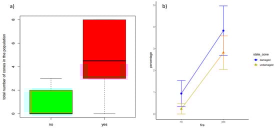To understand the role of fire, we investigated whether fire affects the reproductive organs, i.e., the cones of the species. We found that fire is not linked to differences in sex ratio across the entire population (ANOVA, DF = 1, F = 0.013, p = 0.912). However, we found that fire-prone populations not only possess more cones (ANOVA, DF = 1, F = 13.38, p = 0.0018; Figure 4a), but they also tend to have more damaged cones than unburnt populations (negative GLM; β = 1.77 ± 0.61, p = 0.0035; Figure 4b).