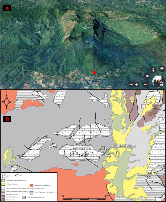 (A) Aerial view of Doi Chiang Dao. Red dot indicates cave entrance at the base of the mountain (from Google Earth Pro); (B) Geological map of Doi Chiang Dao and Tham Chiang Dao.