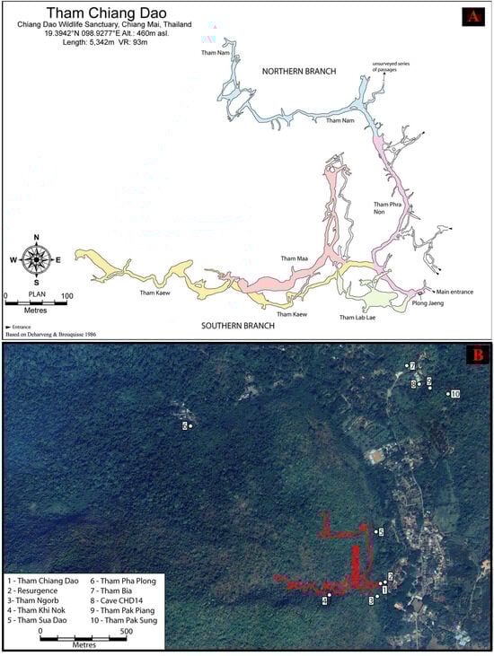 (A) Map of Tham Chiang Dao system, modified from Deharveng and Brouquisse (1986); (B) Tham Chiang Dao system with nearby cave entrances overlaid on Doi Chiang Dao (from Google Earth Pro).