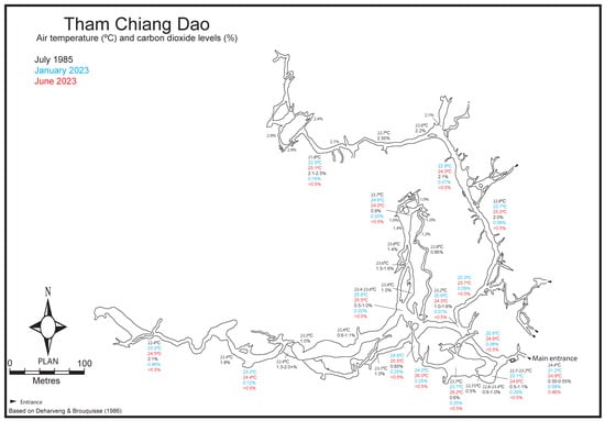 - Windecker, R.C.; Mangkrontong, N.; Siriwitayakorn, S.; Chiraprapoosak, S. Map of Chiang Dao Cave. Tripod-mounted compass and tape survey 1972–73. Nat. Hist. Bull. Siam. Soc. 1975, 26, 1–10. [Google Scholar]