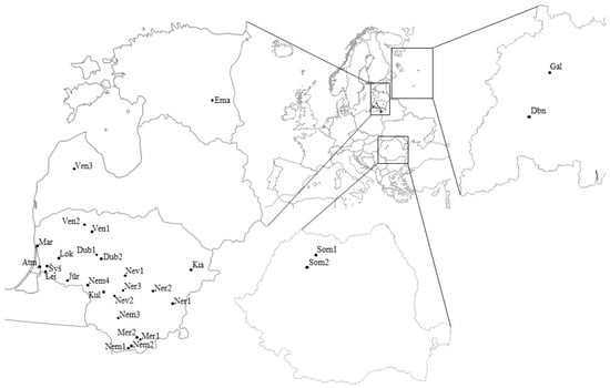 Geographical location of Baltic countries (on the left), Romania (in the middle below), Central Russia (on the right), and sites with populations of Echinosytis lobata evaluated by AFLP. Note: full names of populations are provided in Table 1.
