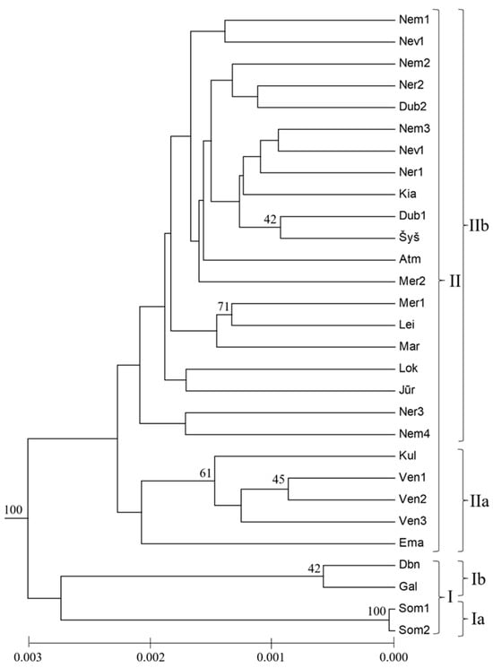 A dendrogram based on Nei’s [] genetic distances using the UPGMA population clustering method showed that the populations fell into two main clusters. The first one consisted of the Romanian and Russian populations and the second one of the Lithuanian, Latvian, and Estonian populations (Figure 3). In the first cluster, the Romanian populations Som1 and Som2 (cluster Ia) were separated from the Russian populations Dbn and Gal (cluster Ib), while in the second cluster, the Estonian Ema, and the Lithuanian and Latvian populations of the Venta and Lielupė basins (Ven1, Ven2, Ven3, Kul; cluster Iia) were separated from the Lithuanian Nemunas basin populations (cluster Iib).