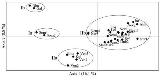 The principal coordinate analysis subdivided the populations of E. lobata into four groups (Figure 4), corresponding to the second-order branches Ia, Ib, Iia and Iib of the population dendrogram (Figure 3): Ia—Romanian population group (Som1, Som2), Ib—Russian population group (Dbn, Gal), Iia—Estonian (Ema) and the population groups of the Venta and Lielupė basins (in Latvia and Lithuania) (Ven1, Ven2, Ven3 and Kul) and Iib—population group of the Nemunas basin (in Lithuania). The first axis of the principal coordinates explained 16.1%, the second axis explained 8.8%, the third axis explained 8.6%, the first two axes explained 24.9%, and all three axes explained 33.5% of the total genetic variability of the populations.