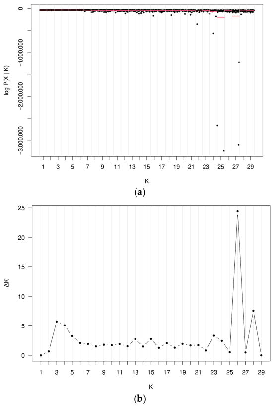 - Evanno, G.; Regnaut, S.; Goudet, J. Detecting the number of clusters of individuals using the software Structure: A simulation study. Mol. Ecol. 2005, 14, 2611–2620. [Google Scholar] [CrossRef]