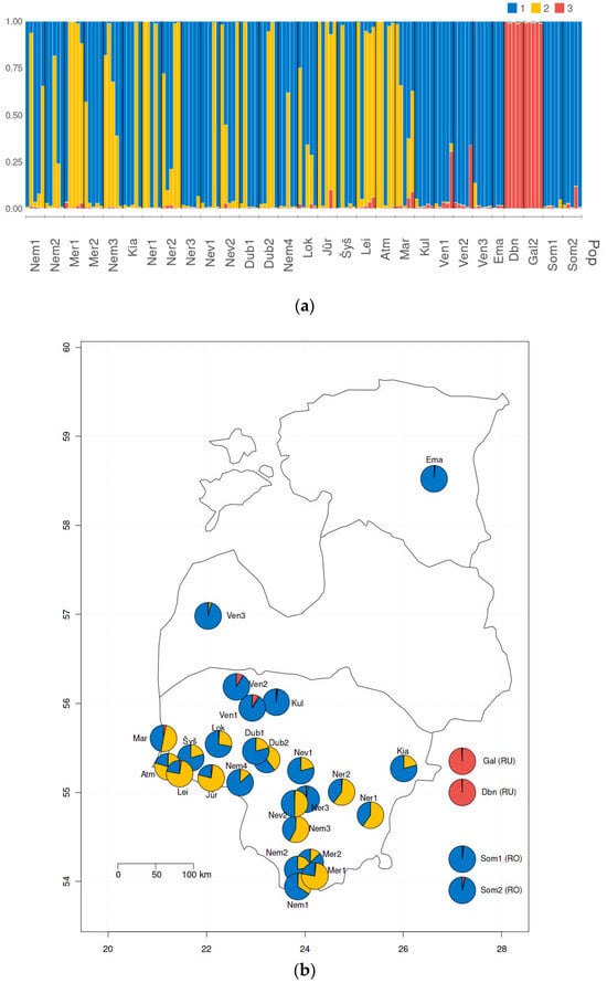 Among the Lithuanian populations, the blue cluster was prevailing in some populations (Ven1, Ven2, Kul, Šyš, Nem4, Lok, Dub1, Dub2, Nev1, Ner3, Nev2, Mer2, Nem1, Nem2, Kia), and the yellow cluster in others (Mar, Atm, Lei, Jūr, Ner1, Ner2, Nem3, Mer1). In the Latvian and Estonian populations (Ven3 and Ema) the blue cluster was dominating—96.3%. In the Romanian populations (Som1 and Som2) the blue cluster also dominated—96.3–98.2%, and in the Russian populations (Gal and Dbn) the red cluster was dominating—99.2–99.4%.
