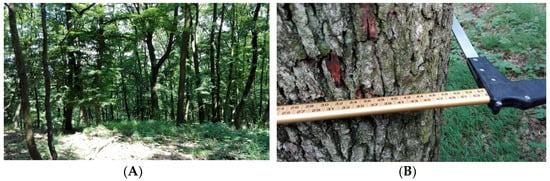 Aspects during field sampling, tree landscape (A), oak (Quercus petraea) tree trunk during measurements (B).