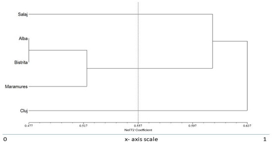 The genetic relationships among these Q. petraea populations were further elucidated through the construction of an Unweighted Pair Group Method with Arithmetic Mean (UPGMA) dendrogram, utilizing Nei’s genetic distances as a basis for the clustering analysis. This dendrogram effectively delineated two primary clusters within the studied populations. Interestingly, populations originating from the same geographical regions displayed notable patterns of high genetic similarity and a clear correlation between their genetic clustering and geographical distribution. Specifically, the first cluster predominantly encompassed the Cluj population, while the second cluster consisted of populations from the Sălaj, Alba, Bistrița-Năsăud, and Maramureș regions (Figure 3). This clustering pattern underscores the role of geographical proximity in shaping the genetic structure of the studied Quercus petraea populations, suggesting that environmental factors and historical processes have contributed to the observed genetic differentiation.