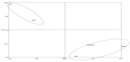 To gain a more comprehensive understanding of the inter-population relationships, we employed Principal Coordinate Analysis (PCoA), which further grouped the oak populations into two distinct clusters, complementing the findings from the UPGMA dendrogram analysis. In this PCoA-based clustering, two populations, namely Cluj and Sălaj, were positioned within the first cluster, while the remaining three populations, Maramureș, Alba, and Bistrița-Năsăud, formed the second cluster (Figure 4). It is worth noting that the two populations grouped together in the first cluster, Cluj and Sălaj, exhibit a notably closer genetic affinity to each other compared to their relationships with the populations in the second cluster. This genetic closeness is corroborated by the Nei’s genetic distance values, where the distance between the Cluj and Sălaj populations was measured at 0.0209. In contrast, the genetic distances between Cluj and Maramureș or Cluj and Alba were notably higher, at 0.0518 and 0.0259, respectively. These genetic distance measurements, as summarized in Table 5, underscore the genetic relatedness of the populations within the first cluster while highlighting their distinctiveness from the populations in the second cluster. This pattern further reinforces the significance of geographical proximity in shaping the genetic structure of these Quercus petraea populations, as observed in both the dendrogram and PCoA analyses.