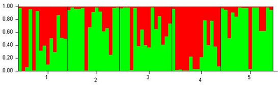 Bayesian clustering analysis (K = 2) based on combined data of SRAP of the Q. petraea; 1—Sălaj; 2—Alba; 3—Bistrița-Năsaud; 4—Cluj; 5—Maramureș.