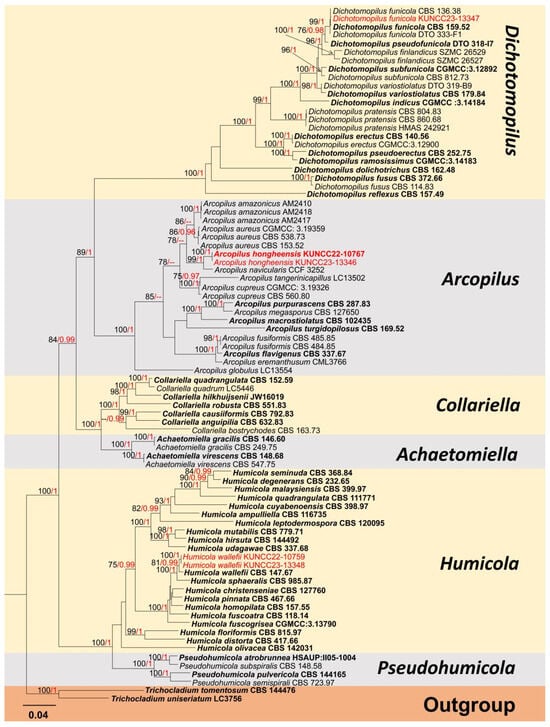 The concatenated LSU, ITS, rpb2, and tub2 sequence datasets consisted of 83 fungal strains of genera, including Achaetomiella, Arcopilus, Collariella, Dichotomopilus, Humicola, and Pseudohumicola, with Trichocladium tomentosum (CBS 144476) and T. uniseriatum (LC3756) used as the outgroups [,]. The combined sequence matrix comprises a total of 83 fungal strains and 2509 characters (563 characters for LSU, 594 characters for ITS, 525 characters for rpb2, and 827 characters for tub2). A phylogenetic investigation based on maximum likelihood analysis yielded the best RAxML tree, with a final likelihood value of −27,870.158799. The matrix consisted of 1188 distinct alignment patterns with 13.04% undetermined characters or gaps. The estimated base frequencies were as follows: A = 0.227002; C = 0.285086; G = 0.282451; T = 0.205461. Substitution rates: AC = 1.108152; AG = 3.236434; AT = 1.315296; CG = 1.271850; CT = 5.563544; GT = 1.000000. Gamma distribution: shape parameter α = 1.135475. The final average standard deviation of the split frequencies at the end of entire MCMC generations was found to be 0.009914 via BI analysis. There were five newly isolated strains. KUNCC23-13347 was basal to Dichotomopilus funicola strains, with 99% via ML and 1.00 via BYPP statistical support (Figure 1); KUNCC22-10767 and KUNCC23-13346 were basal and well separated with Arcopilus navicularis (CCF 3252), with 99% via ML and 1.00 via BYPP statistical support (Figure 1); and KUNCC22-10759 and KUNCC23-13348 were grouped with H. wallefii (CBS 147.67), with 81% via ML and 0.99 via BYPP statistical support (Figure 1).