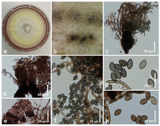 Notes: Our isolate produced similar conidia with the asexual genus Humicola in Chaetomiaceae, as well as similar Chaetomium-like ascospores. Our isolates share similar size asci and ascospores to those of Humicola wallefii CBS 147.67 (Asci: 50 × 7–8 µm vs. 33–52 × 10–15 µm; Ascospores: 6.5–8 × 4.5–6.5 vs. 10–12 × 6–9 µm). In the previous study, H. wallefii was isolated from the soil as a saprobic fungus []. The multi-gene phylogenetic tree also indicated that our isolates were closely related to the strains of Humicola wallefii (CBS 147.67) with high statistical support (Figure 1). Here, we introduced a new host and country record of Humicola wallefii based on morphology and multigene phylogeny.