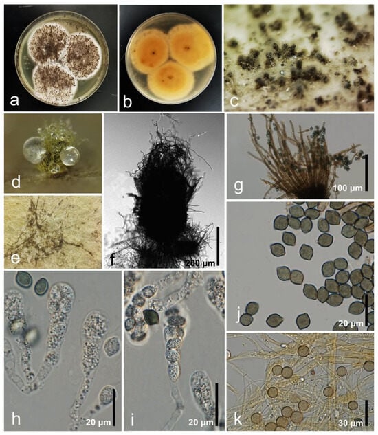 Humicola wallefii (HKAS 129061): (a,b) Colonies on PDA (one month old); (c,d) Ascomata; (e) Conidia formed on hypha; (f) An ascoma; (g) Apical hairs; (h,i) Asci; (j) Ascospores; (k) Conidia with mycelium on PDA.