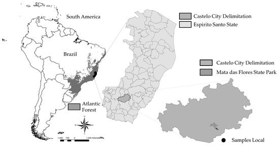 The study was carried out in the Mata das Flores State Park, a conservation unit located in the municipality of Castelo, Espírito Santo state, Brazil, with coordinates 20°35′54″ S and 41°10′53″ W, covering an area of approximately 800 ha (Figure 1). The park is in the Atlantic Forest (Seasonal Semideciduous Montane Dense Ombrophilous Forest) and comprises one of the last remnants of the Atlantic Forest in Southern State [26,27]. Several plant families have been recorded in the park, including Rubiaceae, Euphorbiaceae, Piperaceae, Myrtaceae, Moraceae, and Fabaceae [28,29]. The region has a subtropical climate, with a mild summer and no dry season (Cfb), according to the Köppen climate classification [30].