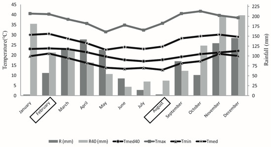 Climograph of the municipality of Alegre, Espírito Santo. R—Rainfall; Tmax—Maximum temperature; Tmin—Minimum temperature; Tmed—Mean temperature. R40—mean rainfall for the period (1950–1990); Tmed40—Mean temperature during the period (1950–1990). Black box mean the period of soil sampling.