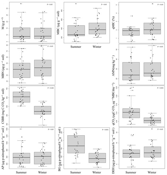 Effect of summer and winter on soil biological properties and moisture, assessed using a Wilcoxon paired t test. MBC = microbial biomass carbon; MBN = microbial biomass nitrogen; AMN = anaerobically mineralizable nitrogen; CSBR = cumulative soil basal respiration; qMIC= microbial quotient; qCO2 = metabolic quotient; AP = acid phosphatase; BG = β-glucosidase; DEH = dehydrogenase; M = soil moisture; P = p value.