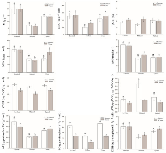 Soil moisture and biological characterization of soil samples collected at a 0.0–0.10 m depth in an Atlantic Forest topographic gradient, in the summer and winter, Brazil. M = soil moisture; MBC = microbial biomass carbon; qMIC = microbial quotient; MBN = microbial biomass nitrogen; AMN = anaerobically mineralizable nitrogen; CSBR = cumulative soil basal respiration; qCO2 = metabolic quotient, AP = acid phosphatase; BG = β-glucosidase; DEH = dehydrogenase. Vertical bars represent the mean standard error. Equal letters, in the same climatic period (uppercase) and in the different topographic positions (lowercase), do not differ among themselves at the 5% significance level using the Dunn test. Letter absence = not significant.