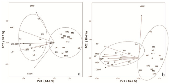 In the principal component analysis, during the summer period, 73.20% of the total variability of the soil biological properties was observed, with 54.48% attributed to the first (PC1) axis and 18.72% to the second (PC2) axis (Figure 5a). PC1 exhibited a negative correlation with the variables MBC, AP, BG, and DEH in the summer, whereas PC2 showed a positive correlation with the qMIC, explaining the data variability in this season. Concerning the winter season, the first two axes accounted for 70.97% of the total data variability, with 55.55% attributed to PC1 and 15.42% to PC2 (Figure 5b). PC1 was negatively correlated with the variables MBC, MBN, CSBR, AP, BG, and DEH, whereas PC2 exhibited a positive correlation with qMIC. The lowland and upland plots showed similarity and were grouped in both the summer and winter seasons (Figure 5a,b).