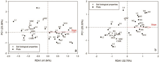 The redundancy analysis of biological properties (Figure 6a,b) was performed to identify the topographic predictor variables influencing the distribution pattern of soil biological properties. For the summer season, the selected variable was slope, which was found to be significant (p = 0.001) and maximized the adjusted R2 value = 0.39. In the winter season, once again, the selected variable was slope (R2 adjusted = 0.29 and p = 0.001). Overall, during the summer season, the RDA1 axis explained 41.64% of the total data variability (Figure 6a), whereas in the winter period, the RDA1 axis accounted for 32.75% of the total data variability (Figure 6b).