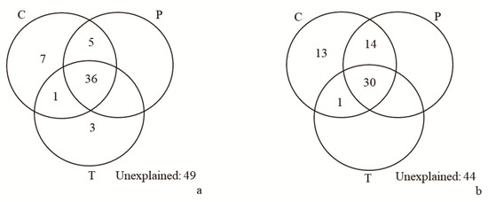 Venn diagrams showing the three sources that contributed to the variation in the soil biological properties in (a) summer and (b) winter: soil chemical (C), physical (P), and topographic (T) properties along a topographic gradient of the Atlantic Forest, Brazil. Adjusted R2 values expressed as %. Negative values are not shown (blank).