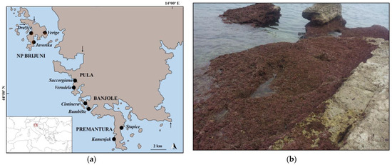 Corallina officinalis sampling locations (black dots) within four investigated areas in south Istria, namely Pula, Banjole, Premantura and NP Brijuni—Brijuni National Park; arrows indicate initial and final mapping points (a). C. officinalis habitat in Javorika Bay in NP Brijuni area (b).