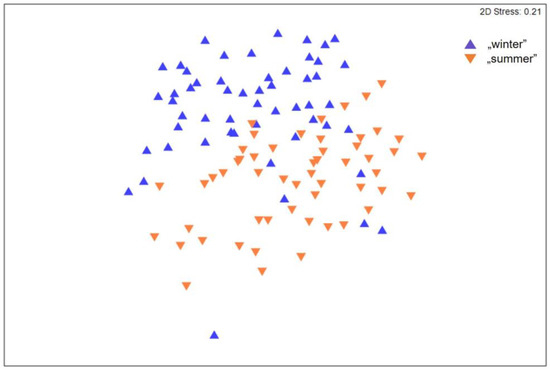 Non-metric MDS ordination based on square root transformation and Bray-Curtis similarity of the total number of individuals during both sampling seasons in nine locations (“winter”—samples taken during the algae’s maximum growth; “summer”—samples taken during the algae’s minimum growth).
