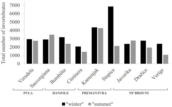 Seasonal variations in the total number of invertebrates, expressed per sampling location described by six replicates, i.e., area of 150 cm2 (“winter” and “summer” having the same definitions as in Figure 2).