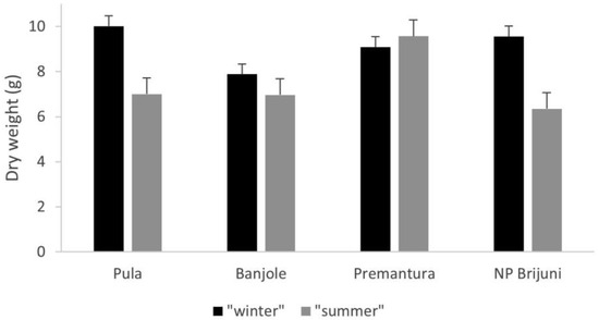 Comparison of C. officinalis average dry weight (g/25 cm2) during both sampling seasons (“winter” and “summer” having the same definitions as in Figure 2).
