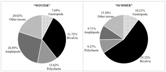 The four previously mentioned dominant taxonomic groups had the highest value of 100% for both sampling seasons in terms of frequency of occurrence. The remaining euconstant taxonomic groups were almost always the same during both sampling seasons. The exceptions were the polyplacophorans and pantopods, whose frequency of occurrence was classified into two different categories depending on the sampling season. The Polyplacophora group had a frequency of occurrence of 62.96% in the winter samples, which placed it in the lower category, while the Pantopoda group had a frequency of occurrence of 33.33% during the summer (Table 1 and Table 3).
